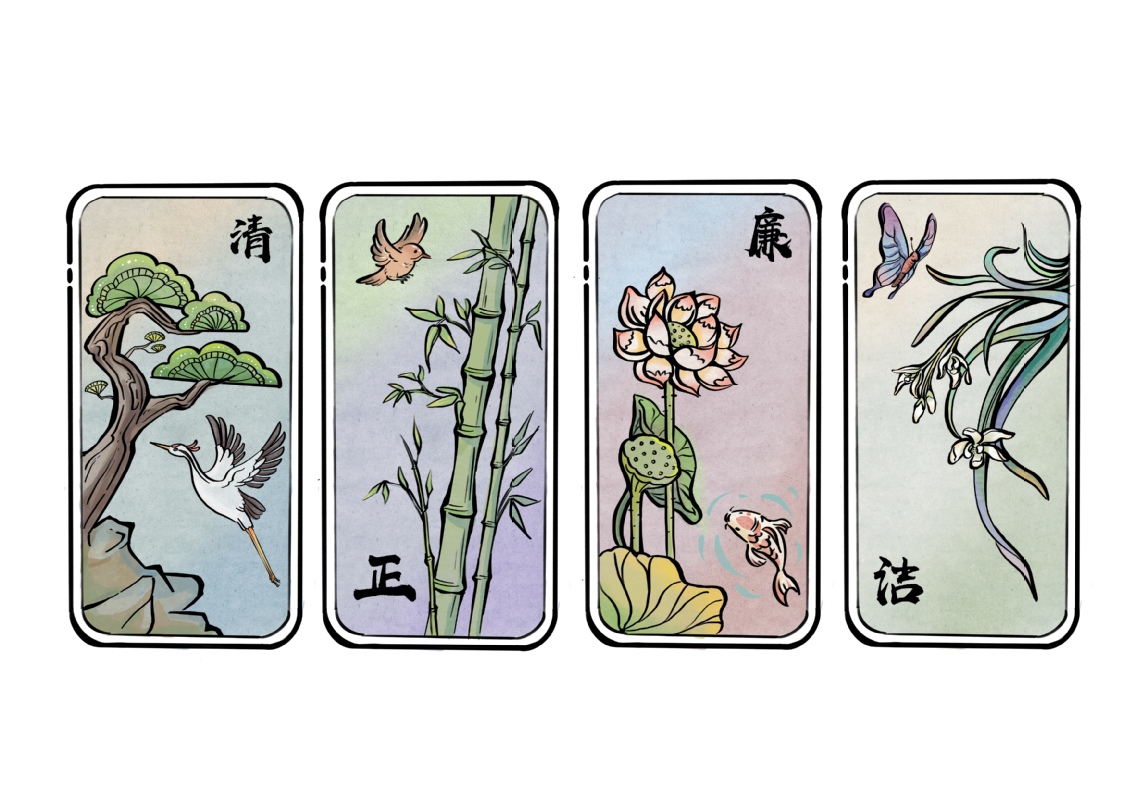 教师组一等奖:图书馆党总支图书馆张琳子。设计说明:本作品用四种植物的寓意,形象深刻表达了廉洁的意义。青松在画中的意义是多方面的,既表达了坚韧不屈的精神,又寓意了长青不衰的生命力,站如松,也表示了内在的骨气;自古以来竹子都是虚心和正气的代表,它表现着自强不息、顶天立地、清华其外、澹泊其中、清雅脱俗、不做媚世之态;莲花从满是淤泥的池塘里长出来,却可以“出淤泥而不染,濯清涟而不妖”象征了高洁清廉的品质,纯洁无瑕;兰花为花中四君子之一,花朵色淡香清,多生于幽闭之处,不与其他花卉争艳,常被看做谦谦君子的象征,表达了品格高尚,不随波逐流的独立精神。
