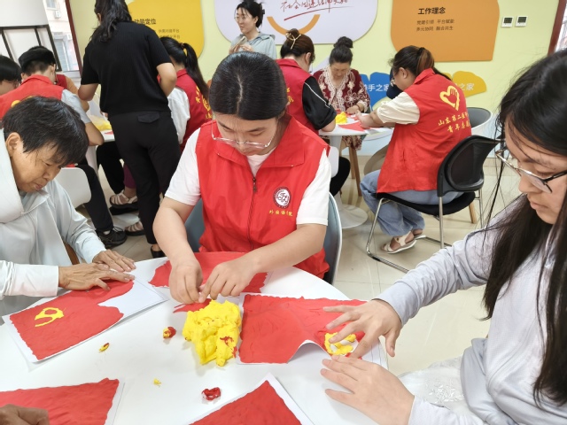 活动伊始,面向鲜红的党旗重温入党誓词。“我志愿加入中国共产党……” 铿锵有力的宣誓声在活动现场回荡。这一环节不仅唤醒了党员们的入党初心,更让党员们深切感受到党组织的庄严与神圣。在泥塑创作环节,党员们与社区志愿者分组协作,分工明确。有的揉制红色泥团作为旗面,有的细致勾勒镰刀锤头轮廓,在创作中交流红色故事。参与者一边捏制锤头一边感慨:“党旗的每一笔都有分量,就像党的历史每一页都沉甸甸的。”“亲手捏制党旗,让我对‘党徽闪耀’有了直观感知,这是触及心灵的党性教育。”