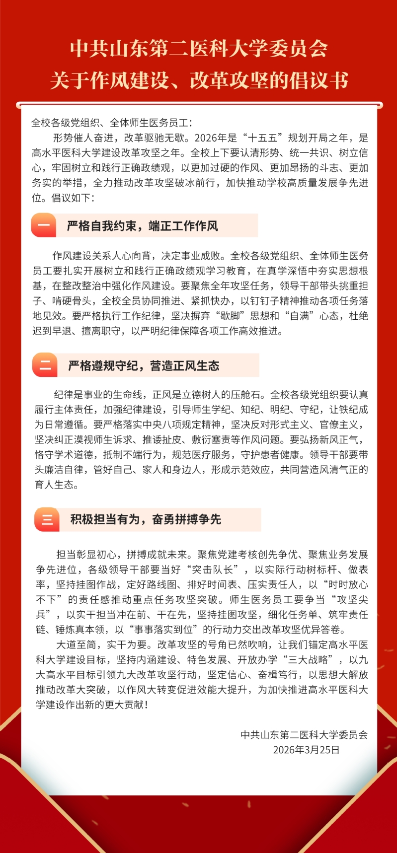 中共山东第二医科大学委员会关于作风建设、改革攻坚的倡议书